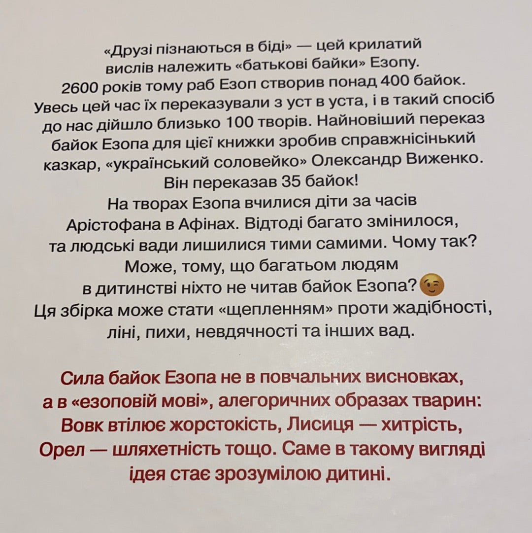 2600 років тому раб Езоп створив понад 400 байок. Увесь цей час їх переказували з уст в уста, і в такий спосіб до нас дійшло близько 100 творів. Найновіший переказ байок Езопа для цієї книжки зробив справжнісінький казкар, «український соловейко» Олександр Виженко. Він переказав 35 байок!