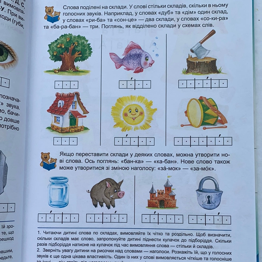 Дитина отримає уявлення про поняття: звук, буква, склад, наголос, основні види слів, речення тощо. Заняття за «Букварем» стимулюватимуть також розвиток сприйняття, уваги, мислення та мовленнєвих навичок.