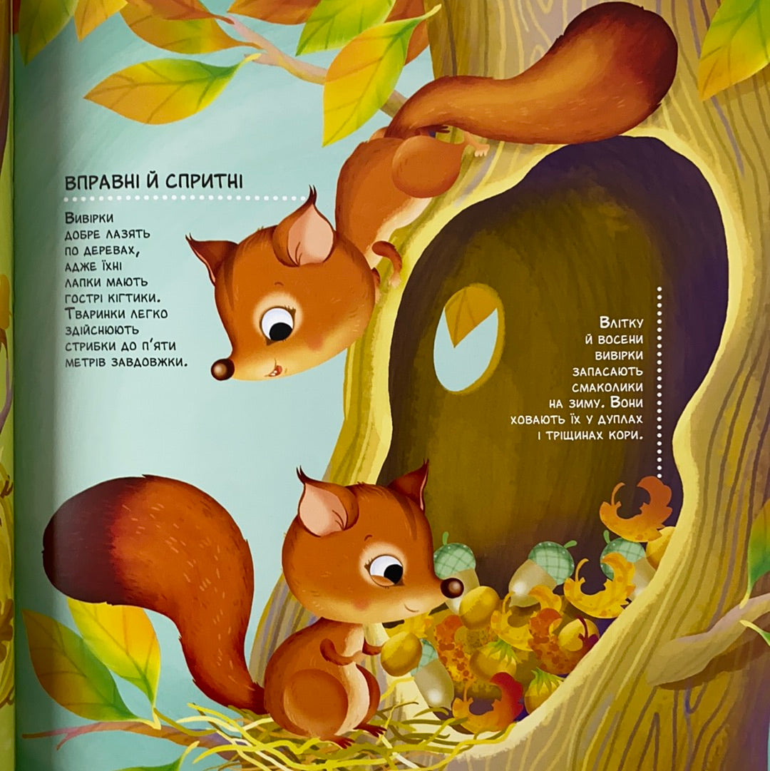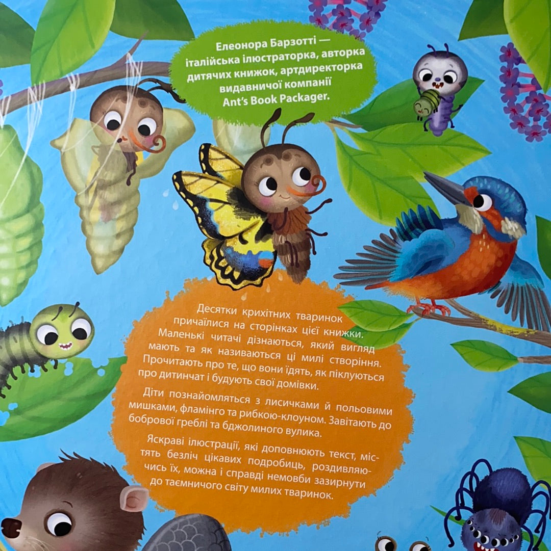 Десятки крихітних тваринок причаїлися на сторінках цієї книжки. Маленькі читачі прочитають їхні назви, дізнаються про особливості поведінки й турботу дорослих звірів про своїх дітлахів. А ще про те, як виховують лисенят, що їсть польова мишка, як бобри будують греблі та багато-багато іншого. Яскраві ілюстрації, які доповнюють текст, містять безліч цікавих подробиць, роздивляючись їх можна і справді немовби зазирнути в нірки до милих тваринок.