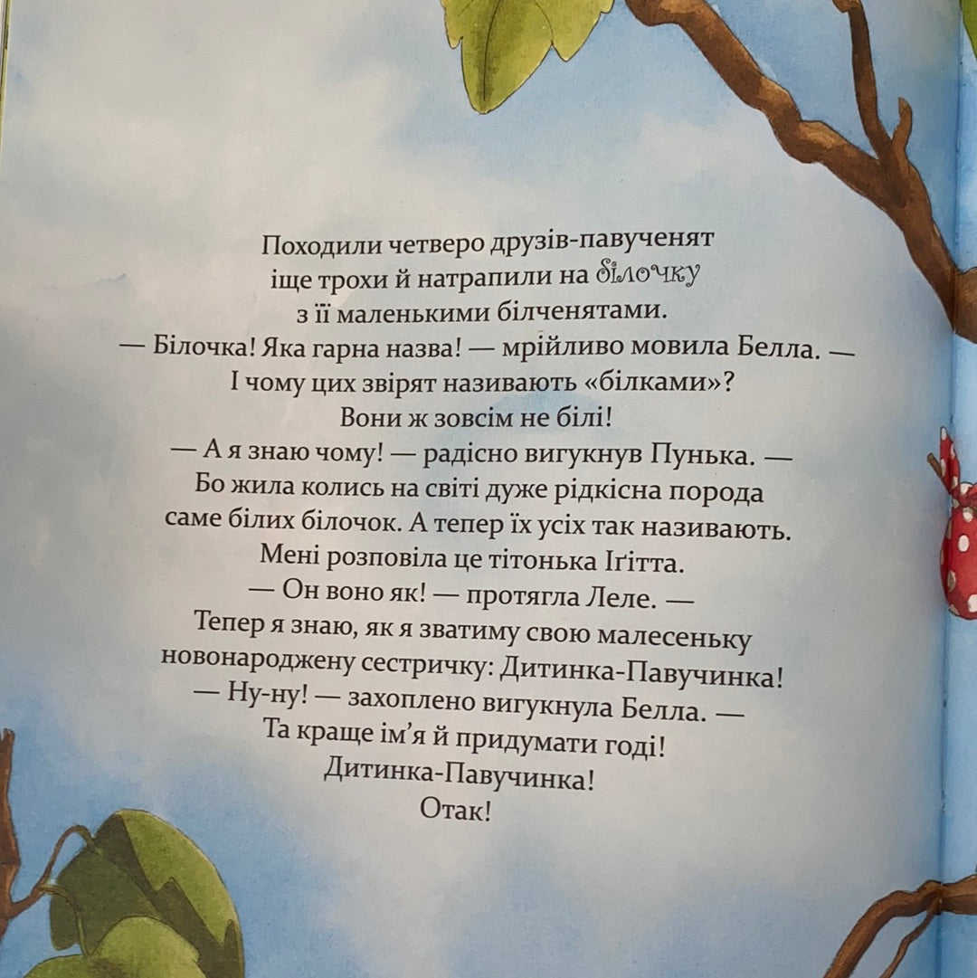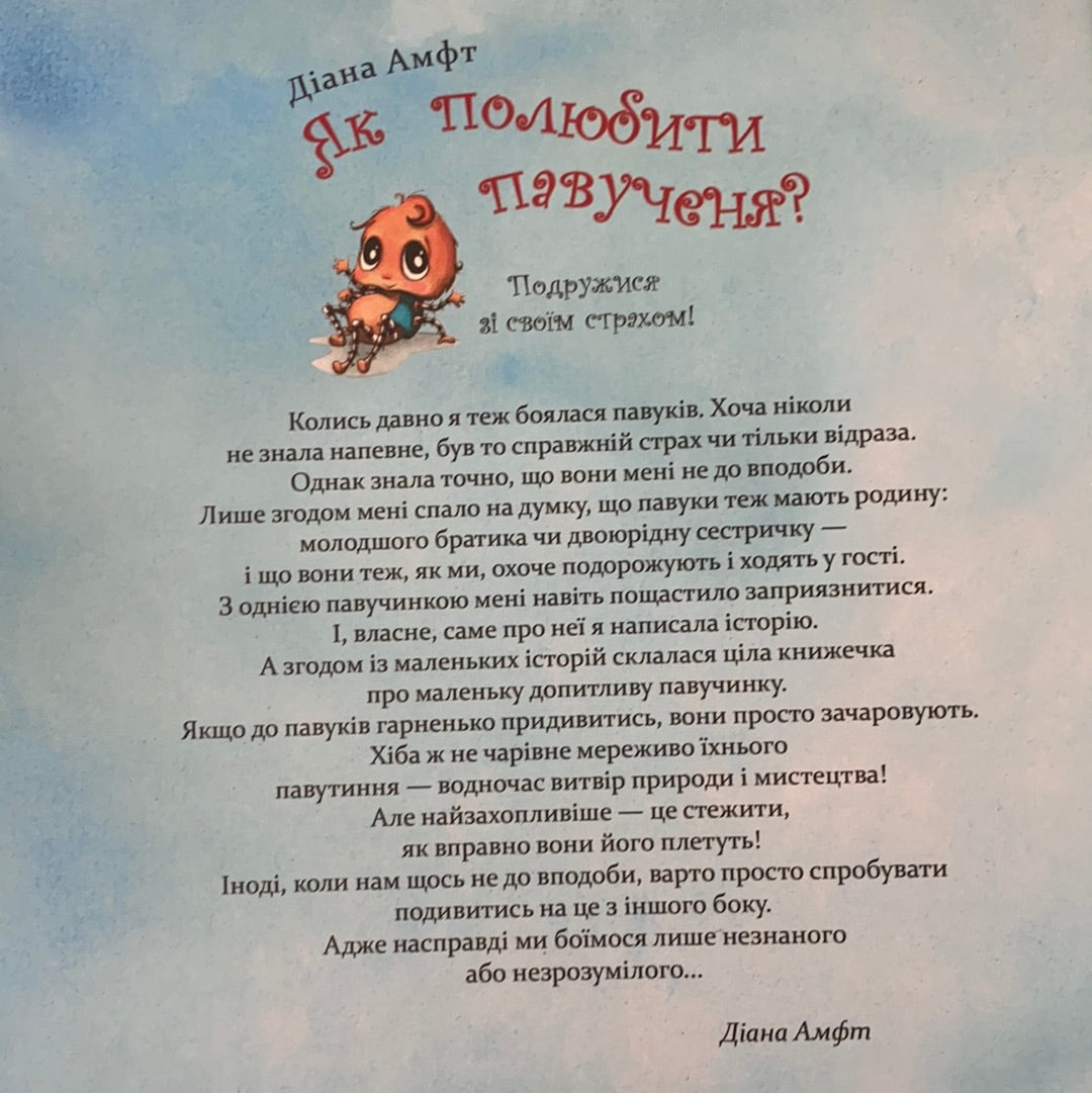 Маленька допитлива павучинка, яку вигадали Діана Амфт і Мартіна Матос, повертається, і не сама, а з друзями, родичами і новими враженнями! Тепер аж чотири казки під однією обкладинкою! Ви дізнаєтеся, чому люди бояться павуків, побуваєте на павучиному дні народження та почуєте цікаві історії про звірів далекої Африки, відвідаєте ферму та познайомитеся з тамтешніми тваринами, а також разом із героями та іншими мешканцями лісу відчуєте радість від того, що в родині з’являється ще одна дитина.