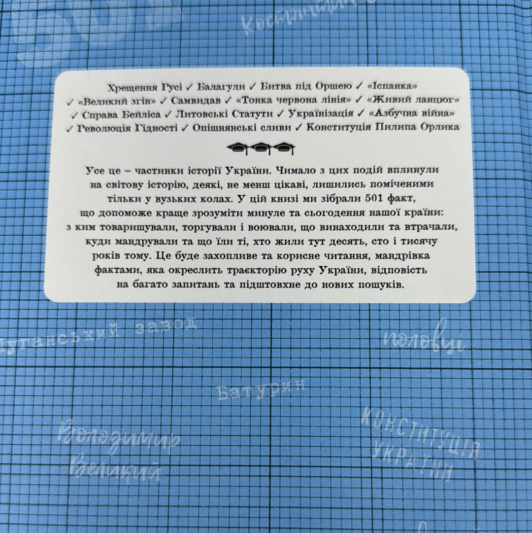 Історія України від мамонтів до сьогодення у 501 факті? Чому б і ні! Цікаві, важливі, часом кумедні, іноді трагічні, а найчастіше — доленосні: не всім цим фактам знайшлося місце у шкільних підручниках, але саме завдяки їм історія стає живою і динамічною. Яке українське місто згадує Гомер у своїй «Одіссеї»? Особистим знаком якого князя було зображення сучасного тризуба? Коли вперше в писемних пам’ятках згадано слово «Україна»? А хто з гетьманів був шанувальником кави? Відповіді на ці та інші питання знайдете на сторінках ілюстрованого довідника. Завдяки книжці «501 факт, який треба знати… з історії України» минуле стає ближчим, а сучасне — зрозумілішим.