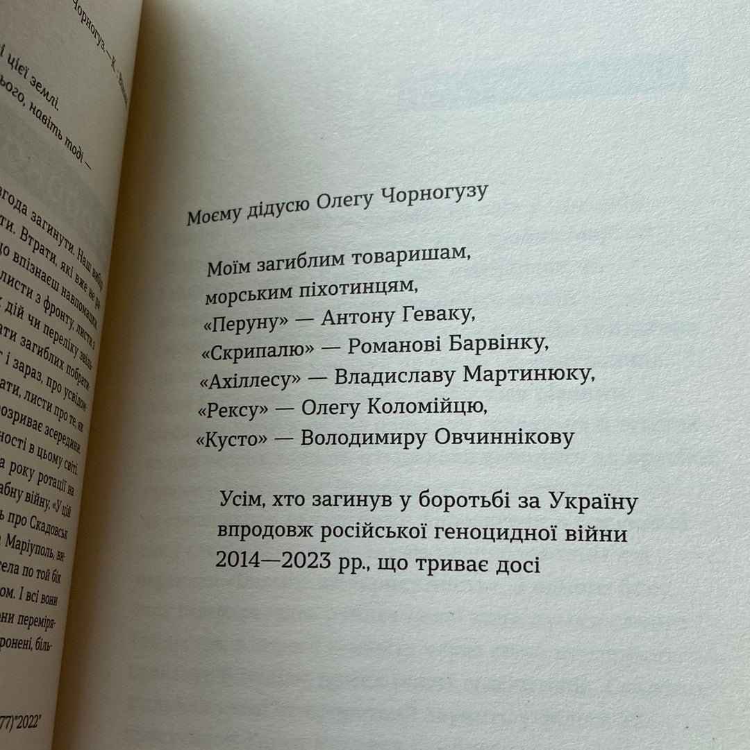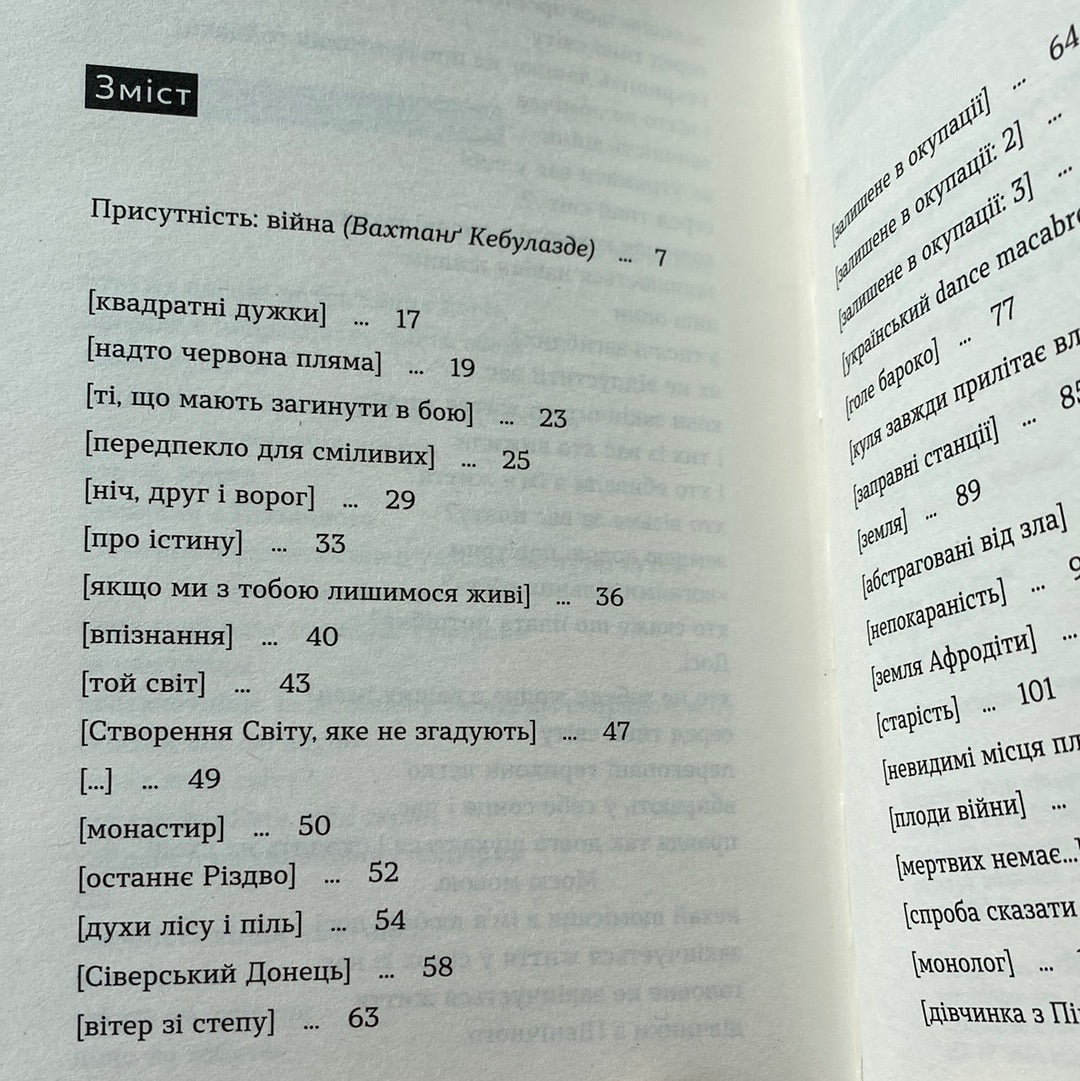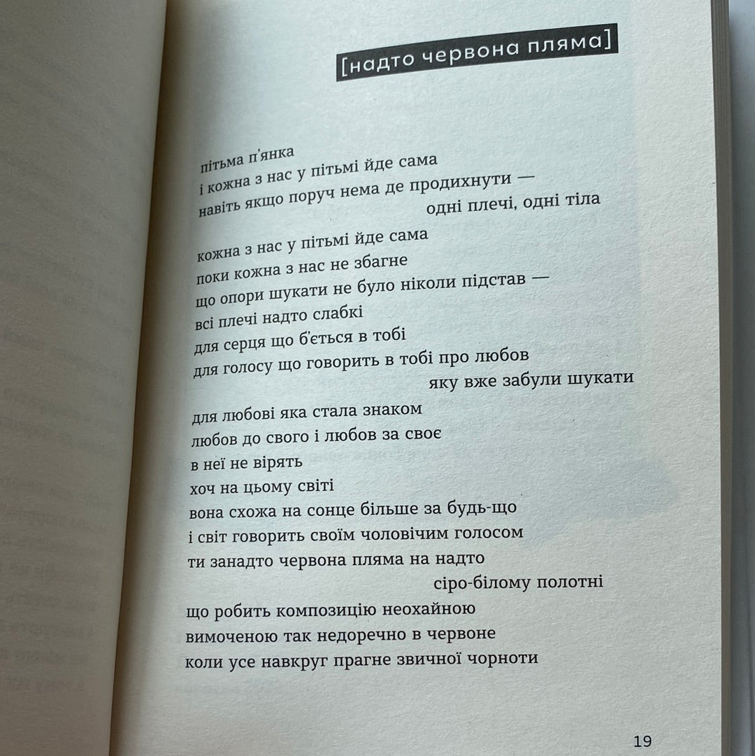 - Збірка віршів військової, яка проживає біль утрати і усвідомлення свого власного місця у цій війні.