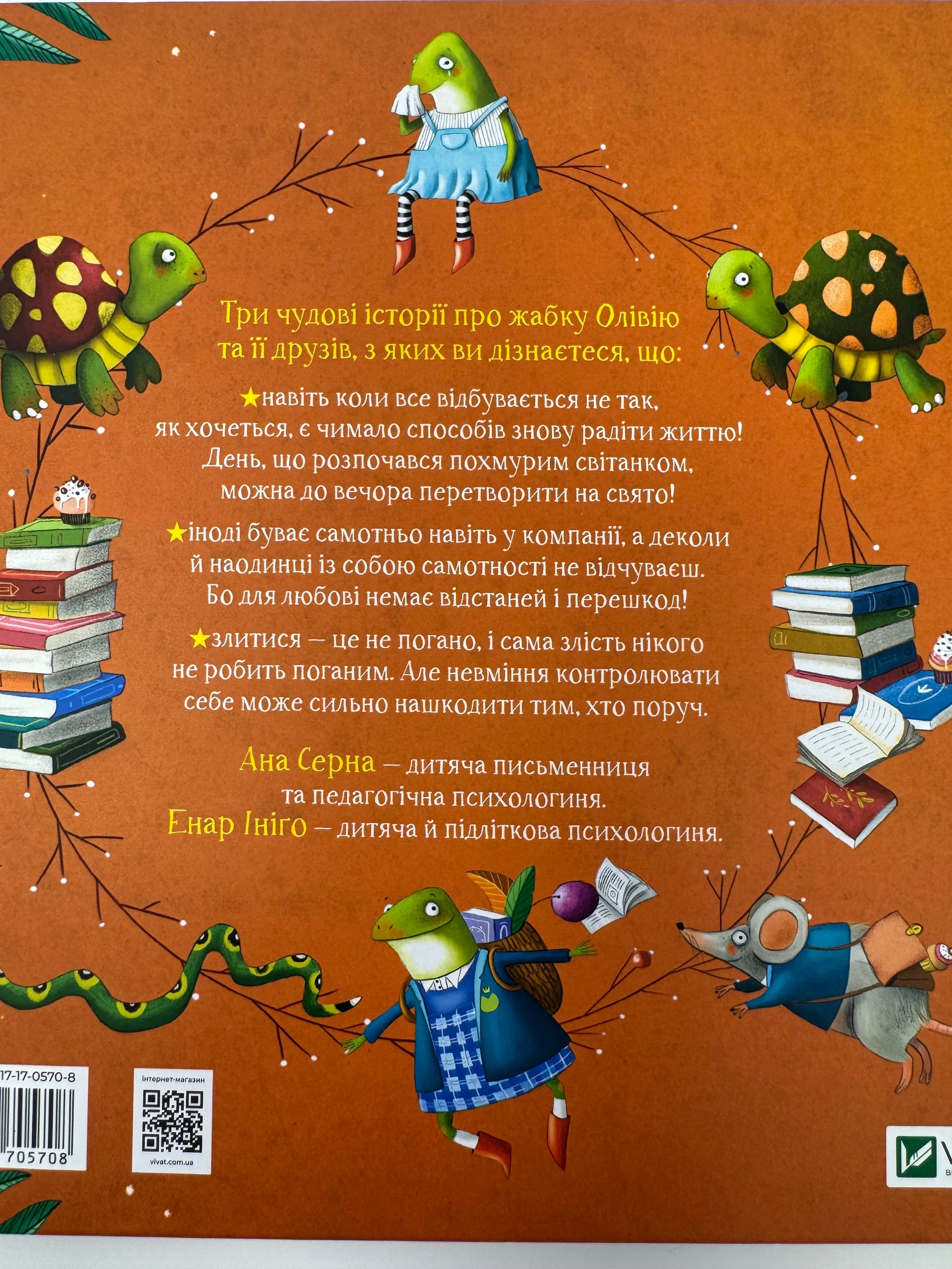 Жабка Олівія переконана: кожен інколи постає перед труднощами й потребує допомоги з контролем своїх негативних емоцій та почуттів, і вона сама не є винятком! Так, Олівія дуже мудра маленька жабка, але навіть із нею трапляються неприємні ситуації, які гнітять і збурюють зсередини. Героїня на власному життєвому досвіді розповість, як мало не потрапила в пастку смутку, злості й самотності, та хто врятував її з біди.
