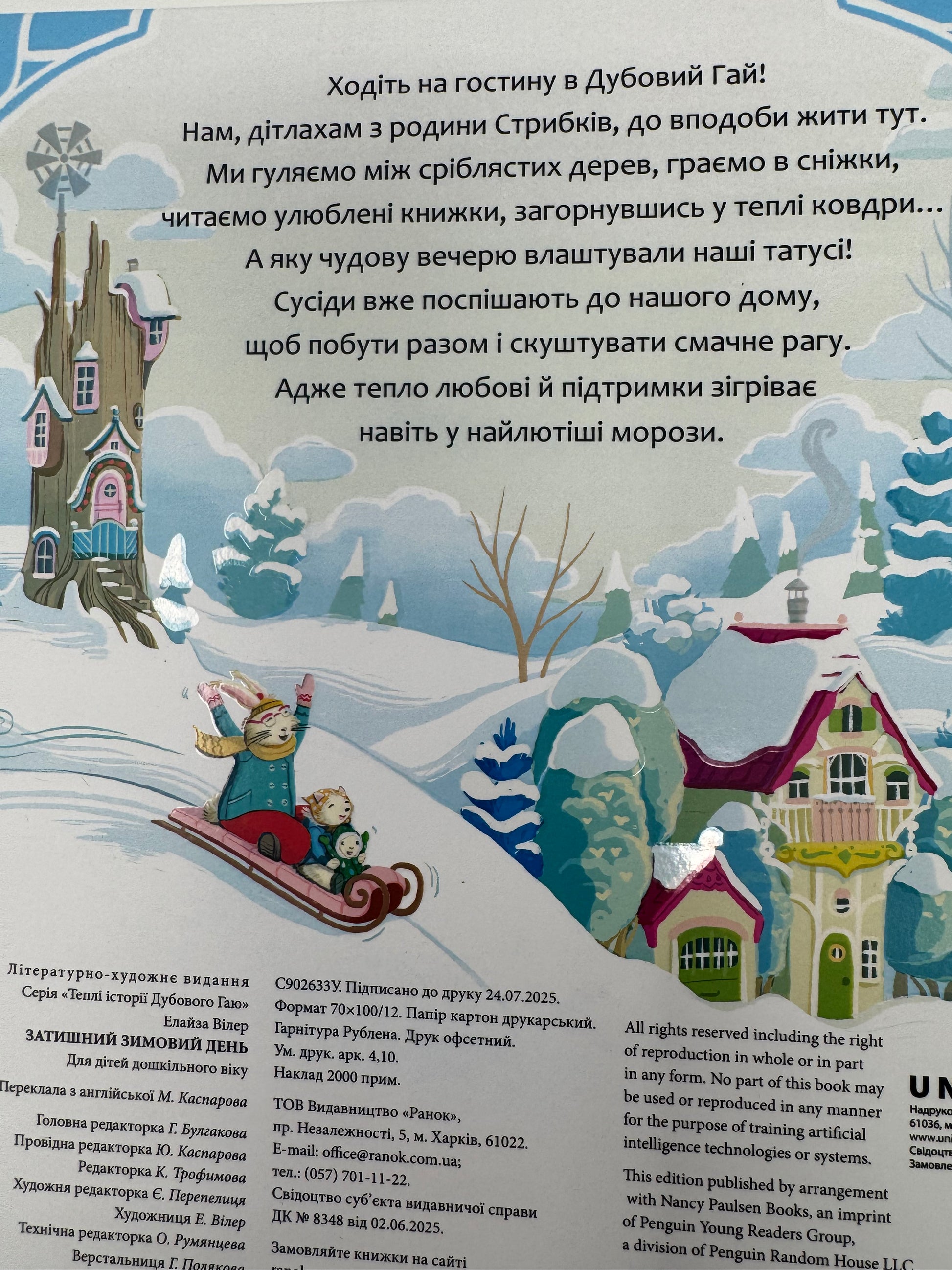 У Дубовому Гаю завжди гамірно! Його мешканці — кмітливі звірята — полюбляють проводити зимові дні разом за затишними справами. Вони читають книжки, печуть смаколики, щось майструють і грають в сніжки.
