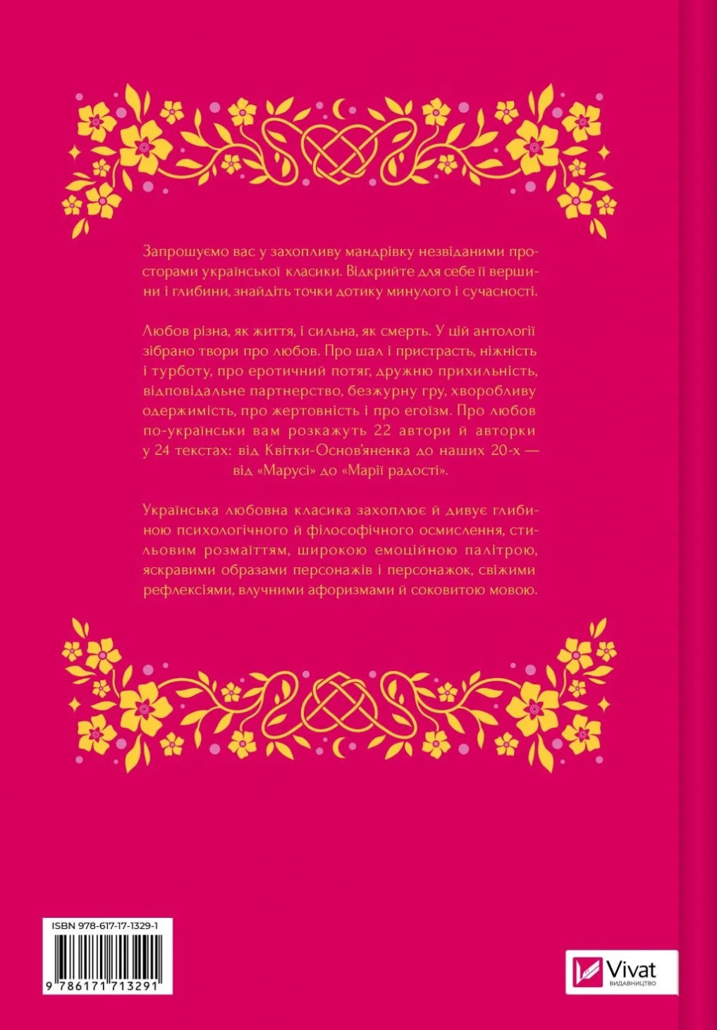 Любов різна, як життя, і сильна, як смерть. У цій антології зібрано твори про любов. Про шал і пристрасть, ніжність і турботу, про еротичний потяг, дружню прихильність, відповідальне партнерство, безжурну гру, хворобливу одержимість, про жертовність і про егоїзм. Про любов по-українськи вам розкажуть 22 автори й авторки у 24 текстах: від Квітки-Основ’яненка до наших 20-х — від «Марусі» до «Марії радості».