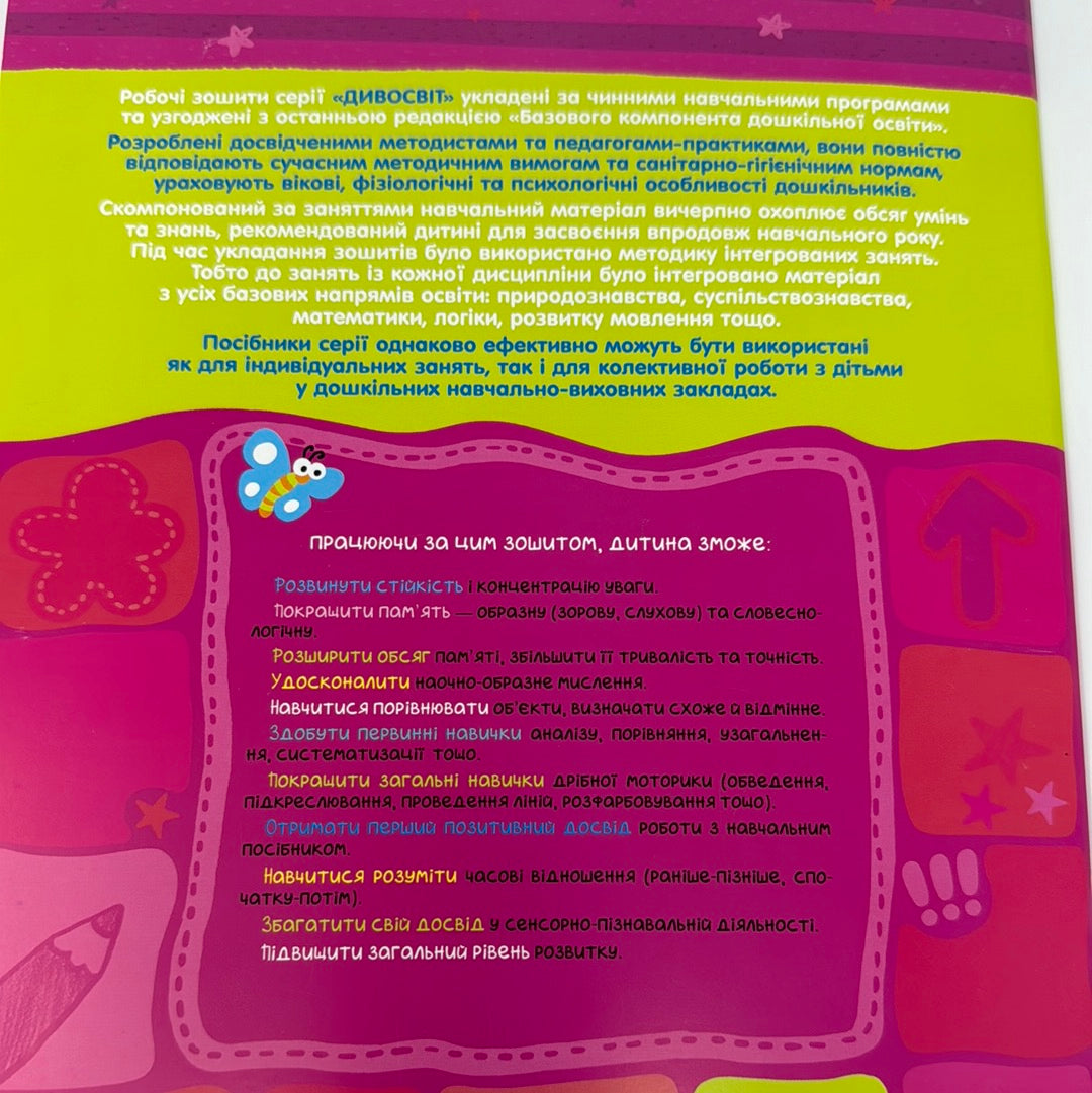 Матеріал зошита допоможе дитині розвинути стійкість і концентрацію уваги, покращити пам’ять і підвищити її обсяг, тривалість та точність. Також дитина матиме змогу потренувати мислення, навчаючись аналізувати, порівнювати, узагальнювати тощо.