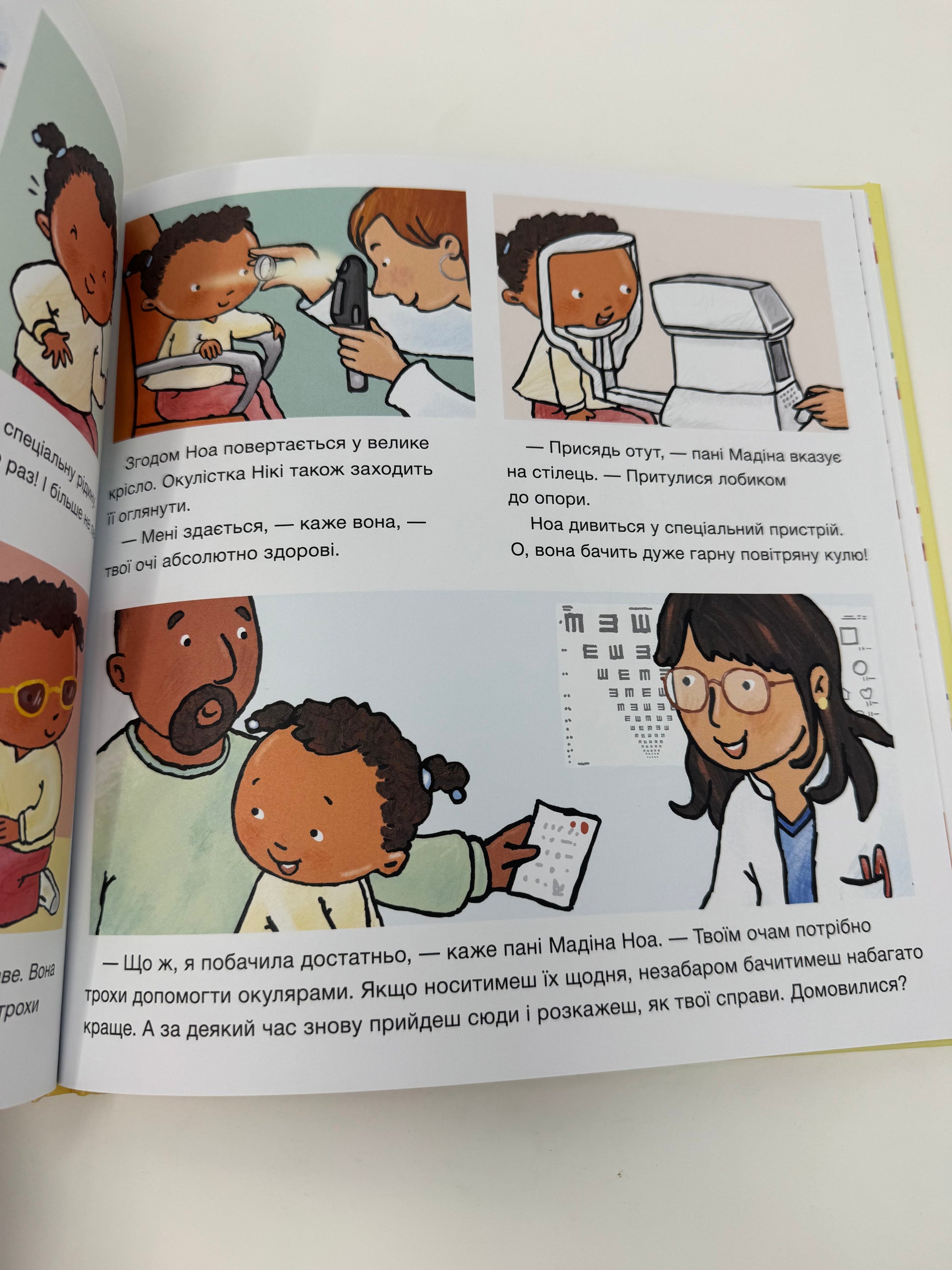 Ноа дуже хвилюється: вона йде перевіряти зір. Разом із лікарем вони виконують різні тести, щоб як слід обстежити очі дівчинки. Згодом Ноа приміряє різні окуляри й обирає найкрасивіші. Їй подобається носити окуляри, адже в них дівчинка знову все чітко бачить! Ця книжка пояснить дитині, як це: погано бачити і почати носити окуляри.