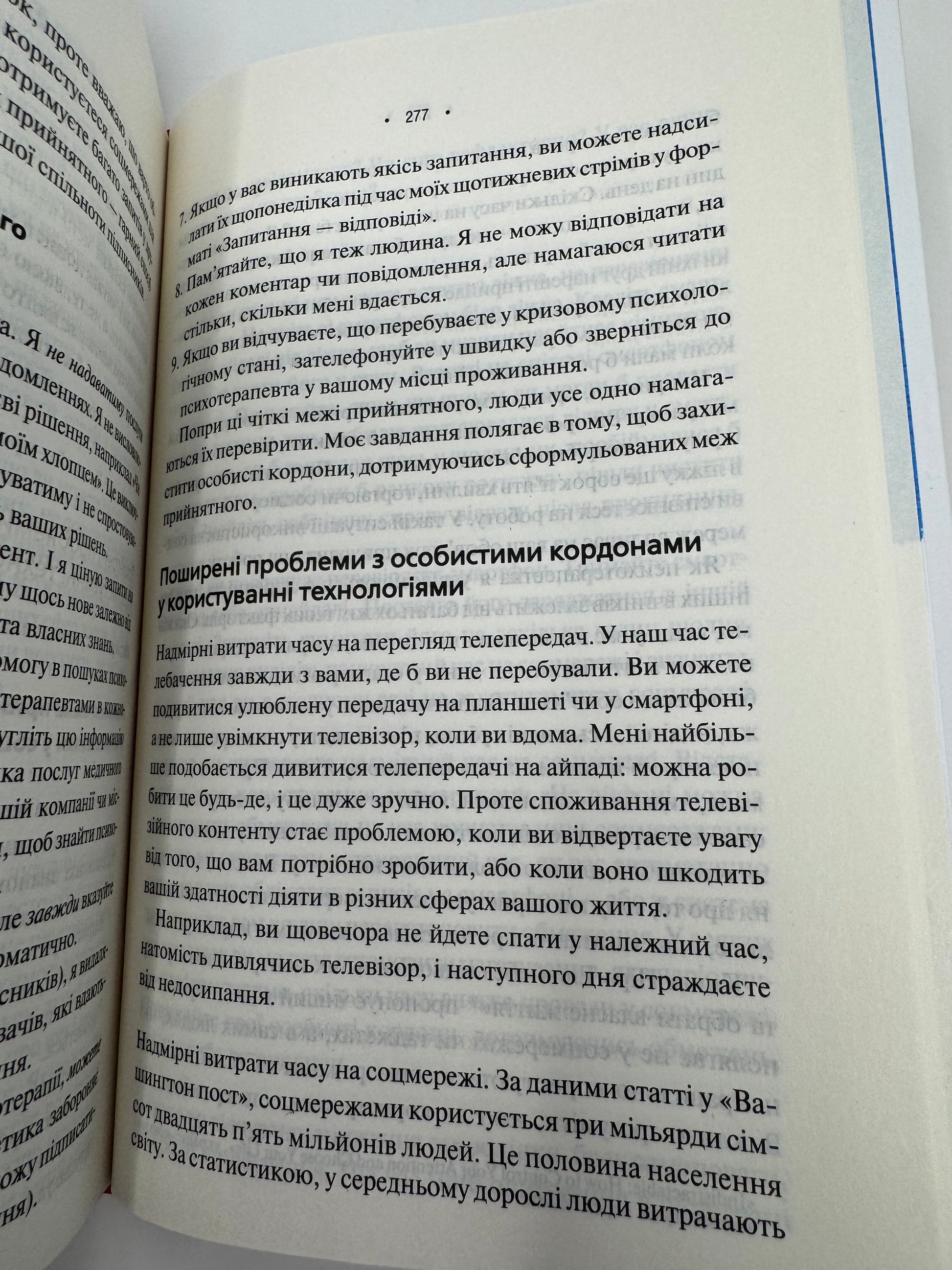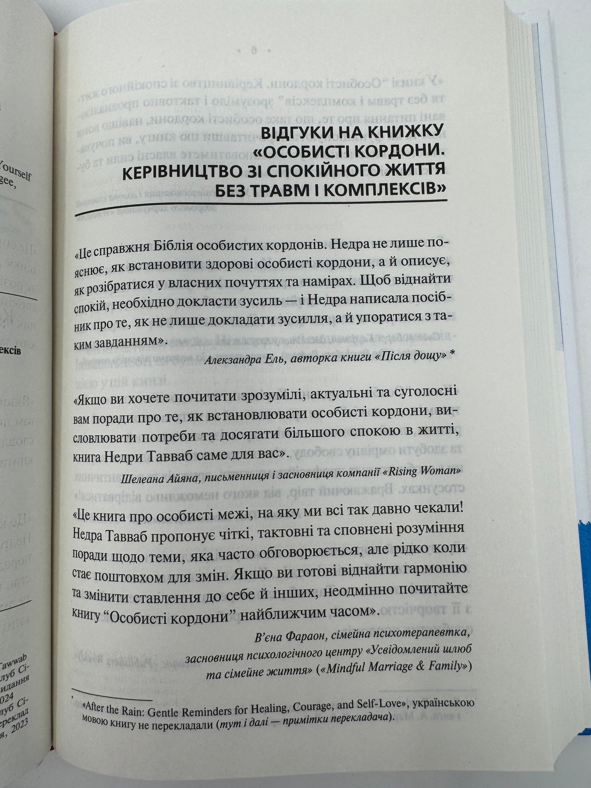 Недра Тавваб зрозуміло і тактовно аналізує питання про те, що таке особисті кордони і які вони бувають, навіщо нам ці межі та як вони функціонують. Поради Тавваб допоможуть почуватися впевненіше, подолати комплекси, пропрацювати травми, усвідомити свої сили, повністю реалізувати власний потенціал і здобути омріяну свободу, чітко встановлюючи здорові кордони в особистому та професійному житті.