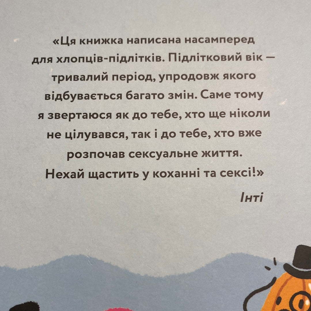 Цей посібник з сексуальної освіти для хлопців-підлітків про те, як підходити до розуміння сексу та стосунків у 21 столітті. Інті Чавес-Перес, який є експертом з сексуального виховання та має багаторічний досвід роботи з підлітками, дає відповіді на ті численні питання про секс, які виникають у хлопців. Автор простою мовою пояснює важливі аспекти про згоду і стосунки, про тілесність, гендерну ідентичність та сексуальну орієнтацію і уникає при цьому будь-якого осуду.