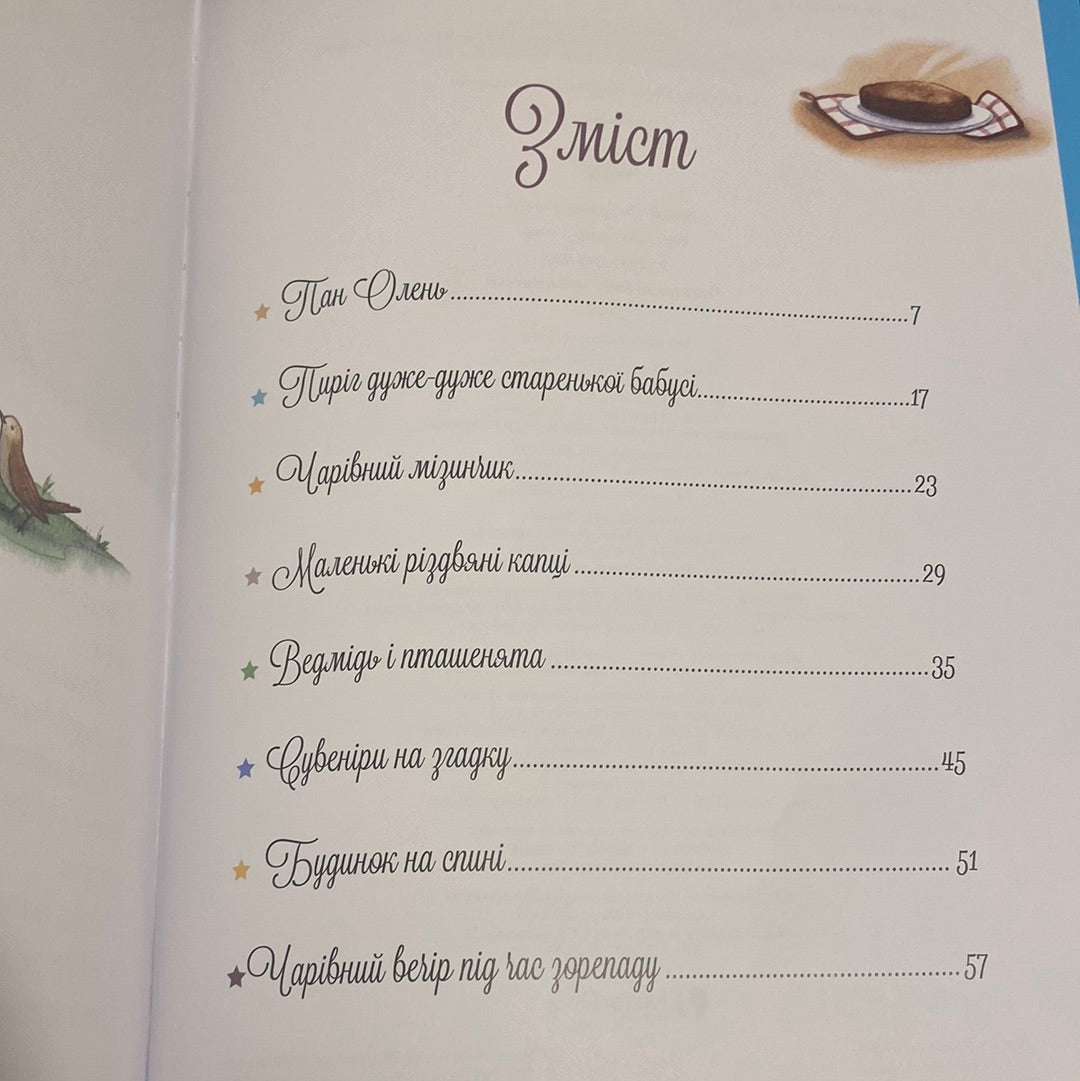 Одного дня ви розкриєте цю книжку і поринете у світ яскравих пригод, сповнених подиху теплого вітру та усмішок друзів. На вас чекатиме шляхетний Пан Олень, якому мишка Цибулька допомагає відшукати загублені сторінки з книжки казок. Ви опинитеся у чарівній атмосфері Різдва у родині пухнастих кроленят. Завітаєте до старого самотнього ведмедя, який знайшов родину солов’їв, що оселилися в його поштовій скриньці…