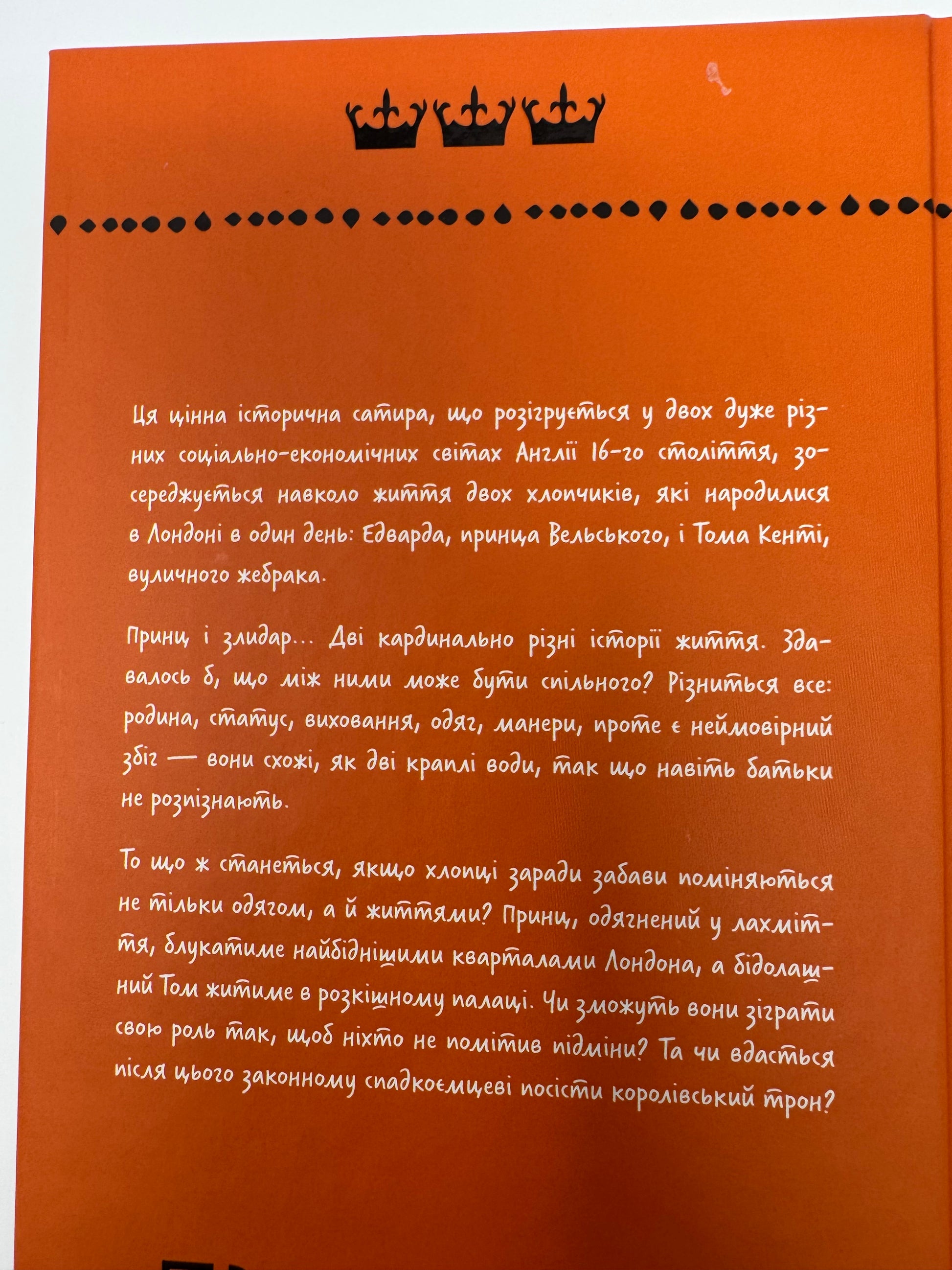 Ця цінна історична сатира, що розігрується у двох дуже різних соціально-економічних світах Англії 16-го століття, зосереджується навколо життя двох хлопчиків, які народилися в Лондоні в один день: Едварда, принца Вельського, і Тома Кенті, вуличного жебрака. Принц і злидар... Дві кардинально різні історії життя. Здавалось б, що між ними може бути спільного? Різниться все: родина, статус, виховання, одяг, манери, проте є неймовірний збіг — вони схожі, як дві краплі води, так що навіть батьки не розпізнають. То що ж станеться, якщо хлопці заради забави поміняються не тільки одягом, а й життями? Принц, одягнений у лахміття, блукатиме найбіднішими кварталами Лондона, а бідолашний Том житиме в розкішному палаці. Чи зможуть вони зіграти свою роль так, щоб ніхто не помітив підміни? Та чи вдасться після цього законному спадкоємцеві посісти королівський трон?