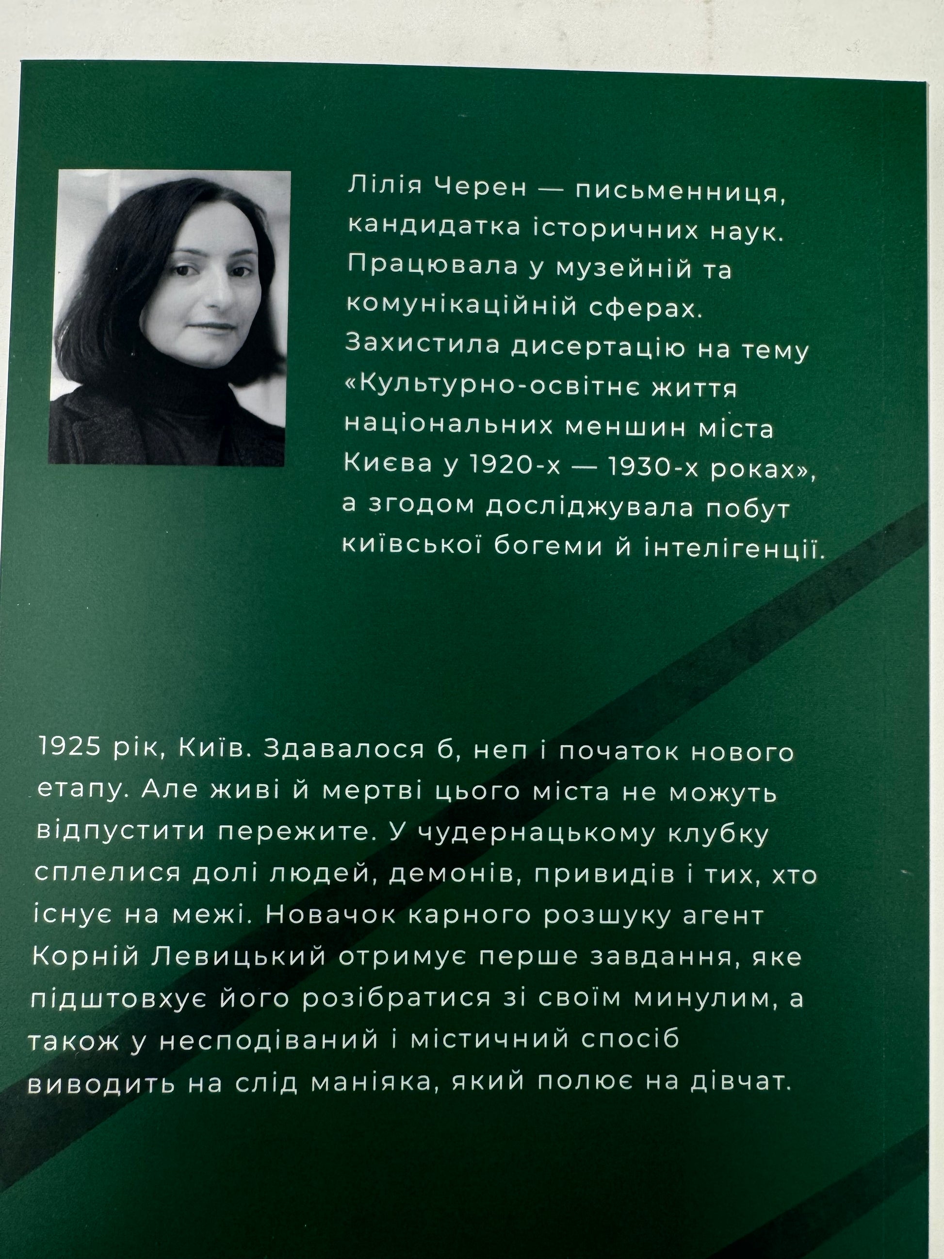 Лілія Черен — письменниця, кандидатка історичних наук. Працювала у музейній та комунікаційній сферах. Захистила дисертацію на тему «Культурно-освітнє життя національних меншин міста Києва у 1920-х — 1930-х роках», а згодом досліджувала побут київської богеми й інтелігенції.