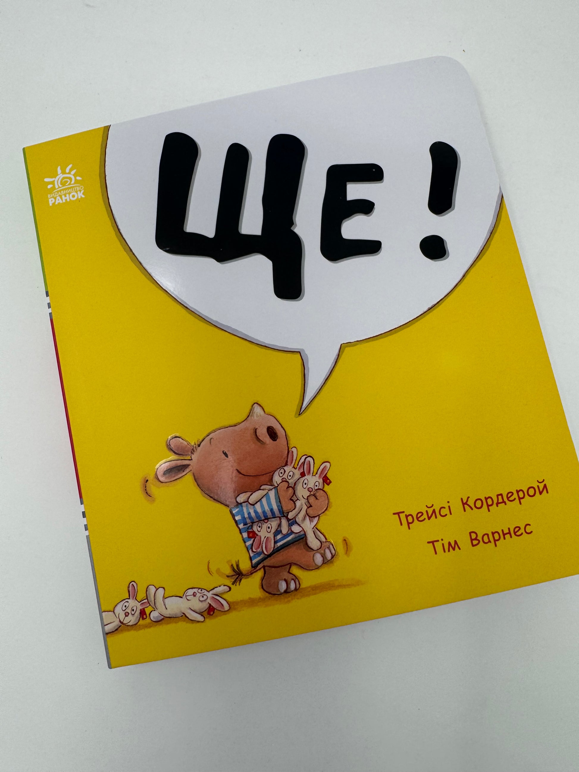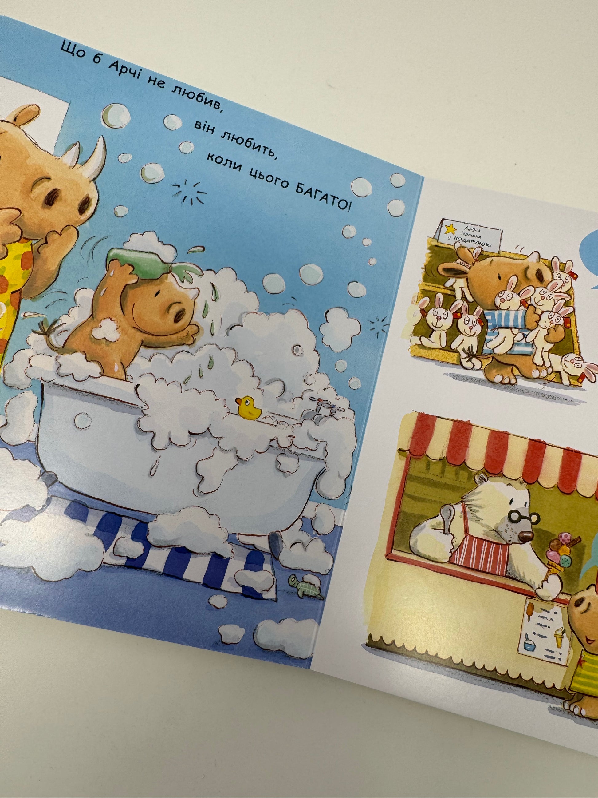 Маленький носоріг Арчі пізнає цей світ і воліє відкривати його дедалі більше. Щоразу він просить: «Ще!» і «Ще!». Ще тістечок, ще деталей для свого винаходу, ще книжок, ще піни у ванній... Що із того виходить? Чудово знають батьки, у яких росте такий самий невгамовний малюк. Гортайте яскраву книжку-картонку разом із дитиною та читайте про маленького носорога ще і ще!