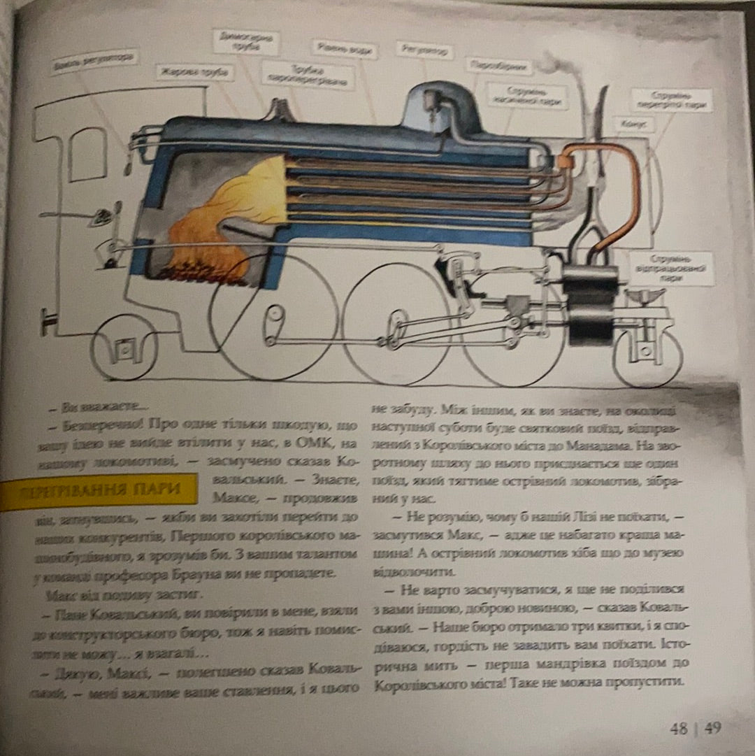 Однак на сторінках книжки читачів чекають не лише технічні таємниці, а й історія кохання юного інженера Макса до художниці Рахель, суперництво за право виготовляти локомотиви, перша мандрівка залізницею і навіть залізнична катастрофа, яка однак служить вдосконаленню поїздів, а не відмові від них.
