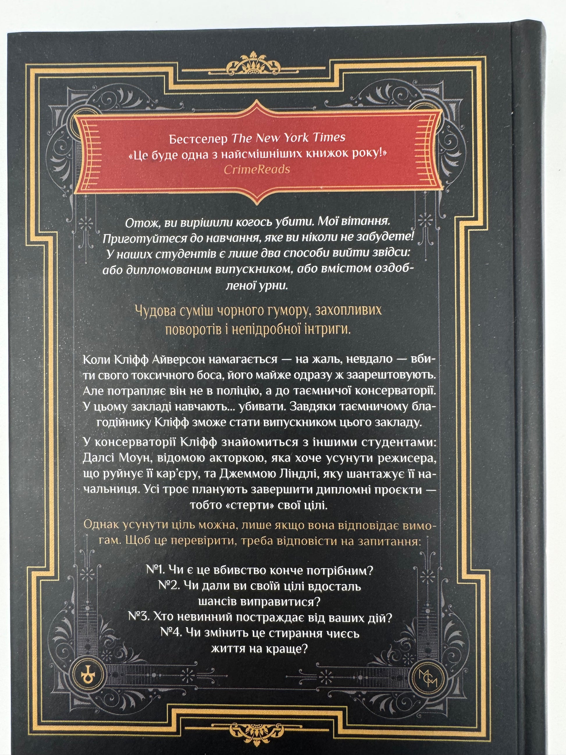 Коли Кліфф Айверсон намагається — на жаль, невдало — вбити свого токсичного боса, його майже одразу ж заарештовують. Але потрапляє він не в поліцію, а до таємничої консерваторії. У цьому закладі навчають… убивати. Завдяки таємничому благодійнику Кліфф зможе стати випускником цього закладу.