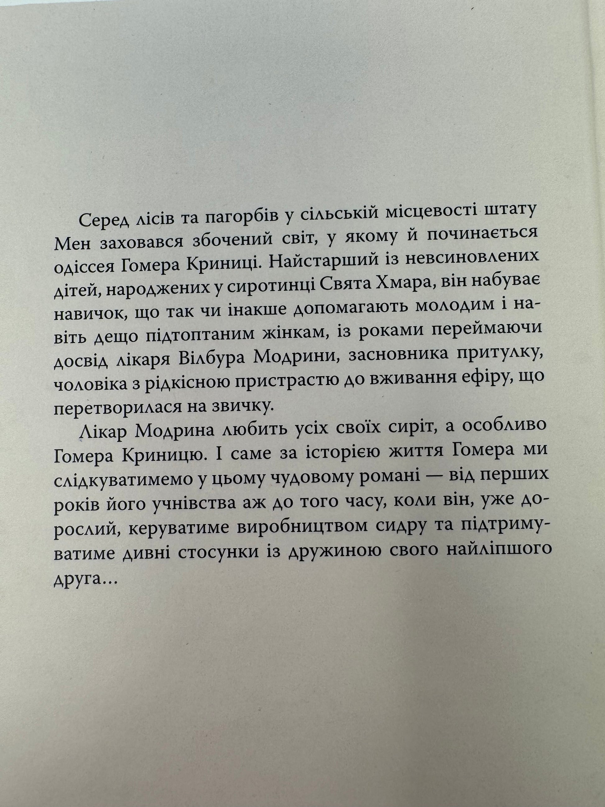 «Правила будинку сидру» — захоплива, багатопланова, інтимна, трагічна та місцями жартівлива книжка, створена одним із найкращих у сучасній американській літературі оповідачів «великих історій». Дія роману розгортається в напівзабутому притулку для дітей-сиріт на узбережжі штату Мен, а його головна тема — усталені правила, писані або ні: чи варто справжній людині грати за ними, чи треба негайно їх відкинути і створити нові, власні, більш гуманні. Але перелік тем, що їх досліджує автор, набагато ширший — це війна і зрада, питання існування душі і насильства над жінкою, інцест і смерть, право на вчинок і власна доля. Автор уникає моралізаторства, а його герої — сирота Гомер Криниця та очільник притулку Свята Хмара Вілбур Модрина, яких читач неодмінно вподобає, є справжніми «стовідсотковими порушниками правил».