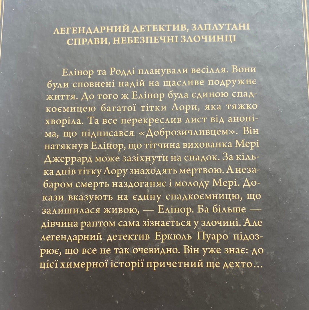 Елінор та Родді планували весілля. Вони були сповнені надій на щасливе подружнє життя. До того ж Елінор була єдиною спадкоємицею багатої тітки Лорі, яка тяжко хворіла. Та все перекреслив лист від аноніма, що підписався "Доброзичливцем". Він натякнув Елінор, що тітчина вихованка Мері Джеррард може зазіхнути на спадок. За кілька днів тітку Лорі знаходять мертвою. А незабаром смерть наздоганяє і молоду Мері. Докази вказують на єдину спадкоємницю, що залишилася живою, - Елінор. Ба більше - дівчина раптом сама зізнається у злочині. Але легендарний детектив Еркюль Пуаро підозрює, що все не так очевидно. Він уже знає: до цієї химерної історії причетний ще дехто