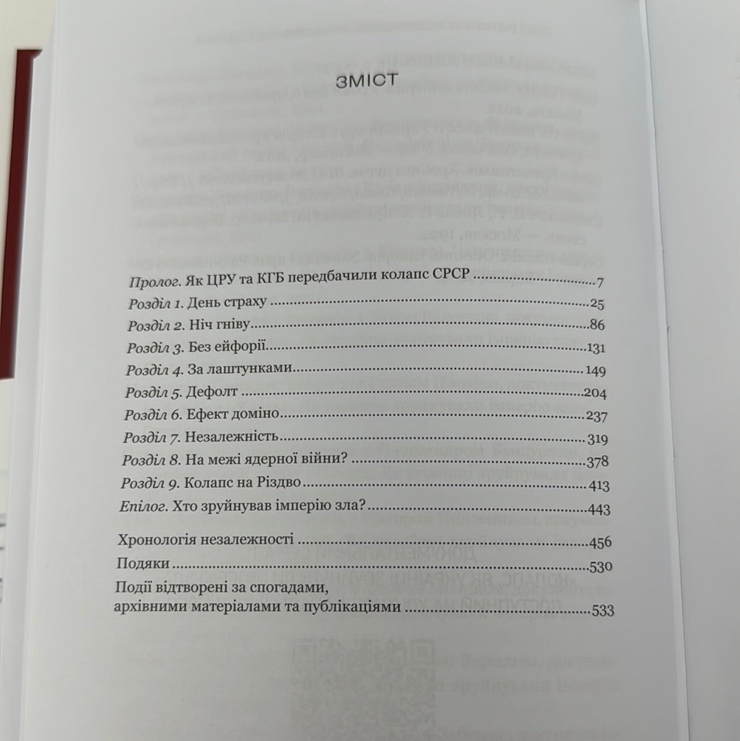 Наприкінці липня 1991 року в доповідній КГБ Голові Верховної Ради УРСР Леонідові Кравчуку повідомляли про сценарій можливого розпаду СРСР, який спрогнозували в США. Голова КГБ СРСР Володимир Крючков стверджуватиме, що ще кількома роками раніше комуністичні спецслужби відчували наближення колапсу. Що відбувалося за лаштунками Серпневого путчу, який зробив розпад СРСР швидким і незворотним? Як сталося, що із чотирьох сценаріїв розвитку подій, описаних у прогнозі ЦРУ, українці обрали найрадикальніший — «Розпад»? У цій книжці автор поденно відтворює події 1991 року. Наводить ще донедавна секретні архівні документи ЦРУ і КГБ. Уперше зіставляє спогади учасників і свідків здобуття Україною незалежності: політиків, істориків, письменників. І відповідає на запитання, хто насправді зруйнував імперію зла.